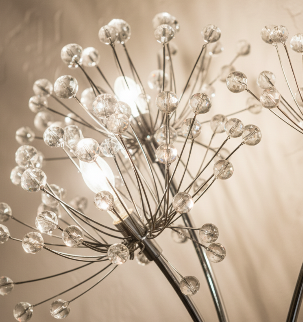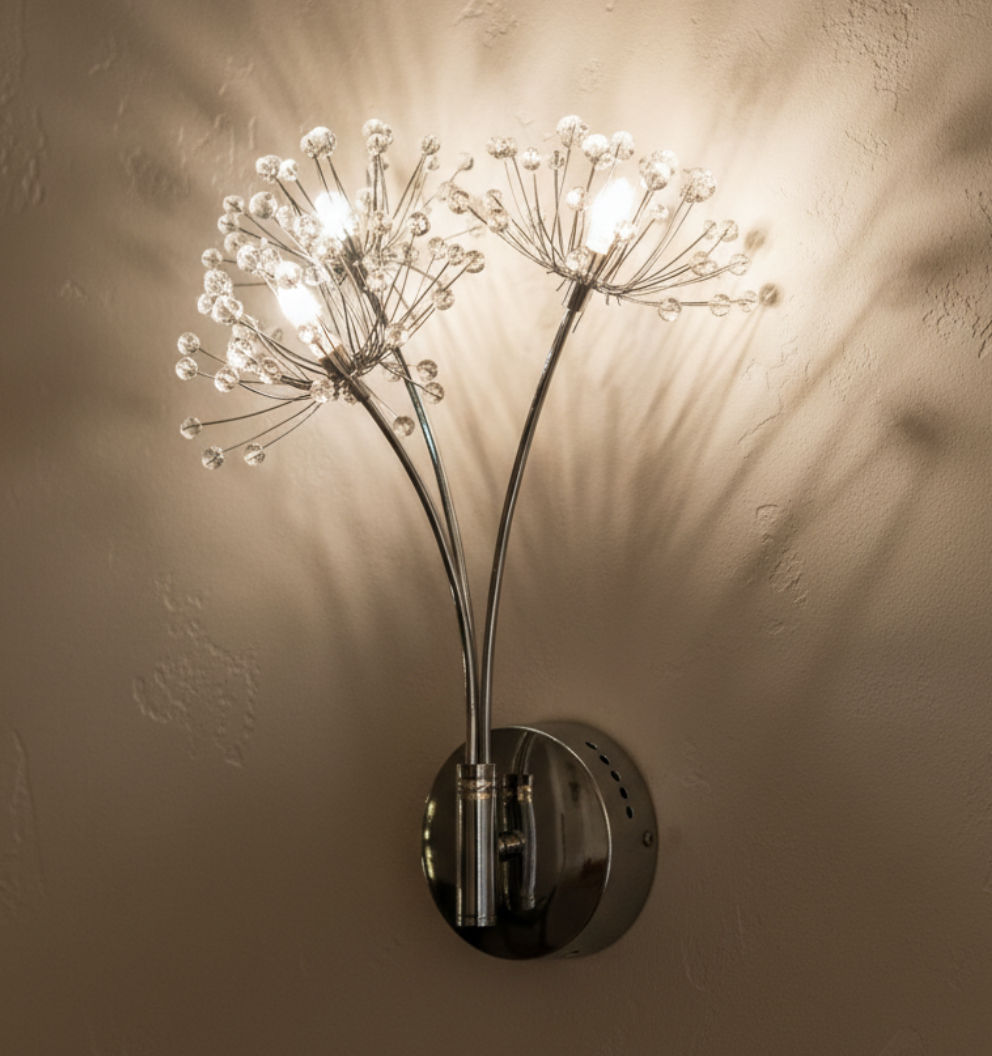 This elegant crystal wall sconce combines minimalist elegance with sparkling crystal accents, presenting a modern wall light inspired by a delicate dandelion design. This eye-catching fixture embodies lightness, resembling a floating dandelion. The fine crystal elements refract light, creating a vibrant sparkle that enhances any room. Ideal for the living room, hallway, or bedroom, this lamp not only serves as a decorative accent but also provides atmospheric lighting.