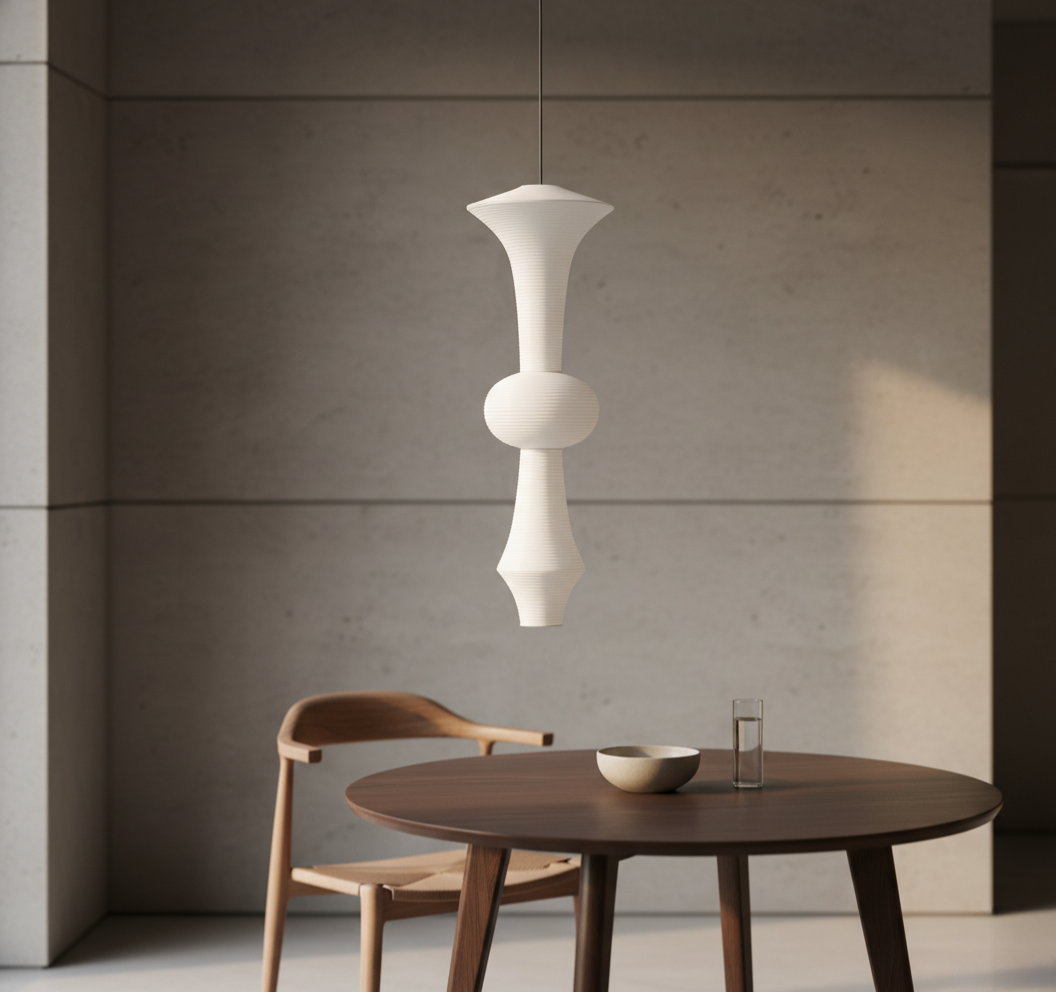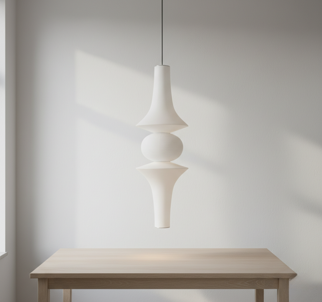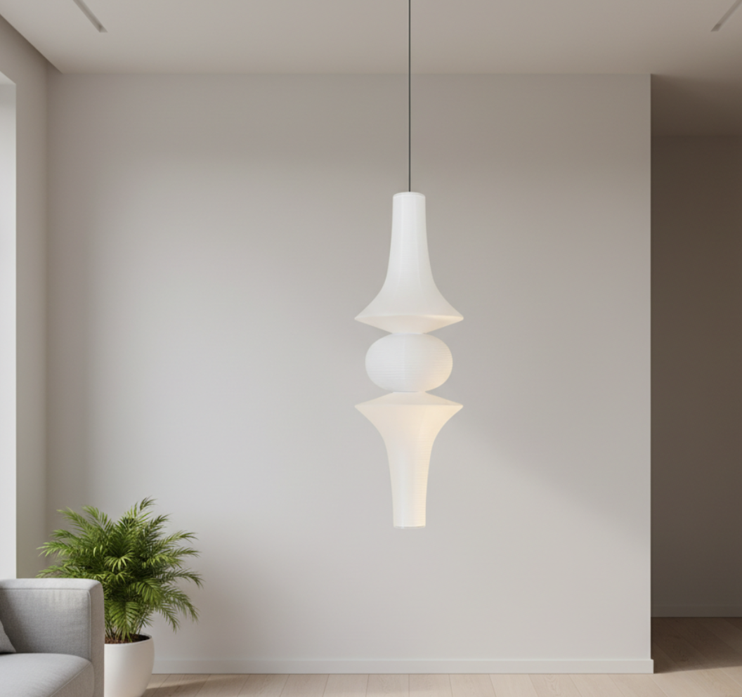 - Sculptural pendant lamp defined by balance, symmetry, and serene proportion