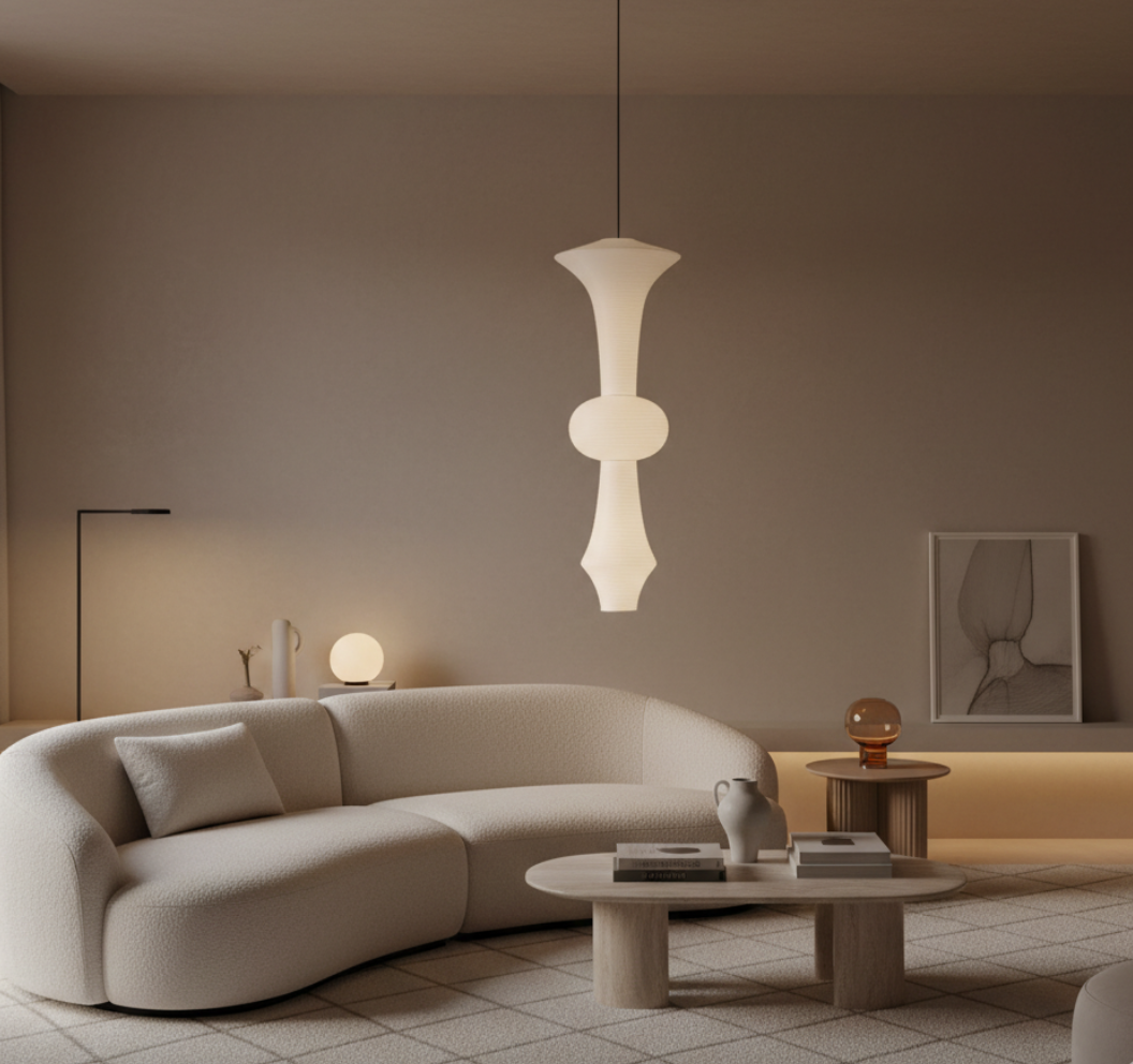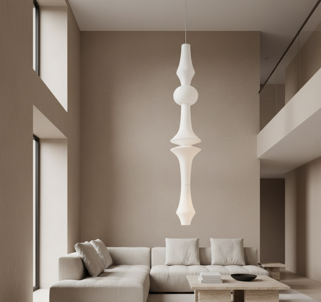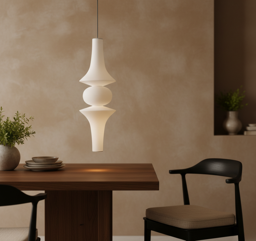 - Sculptural pendant lamp defined by balance, symmetry, and serene proportion