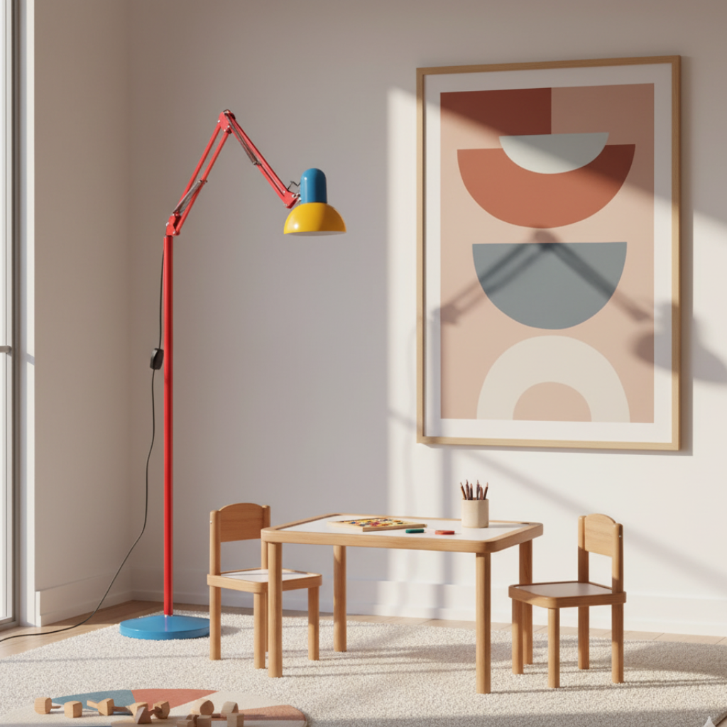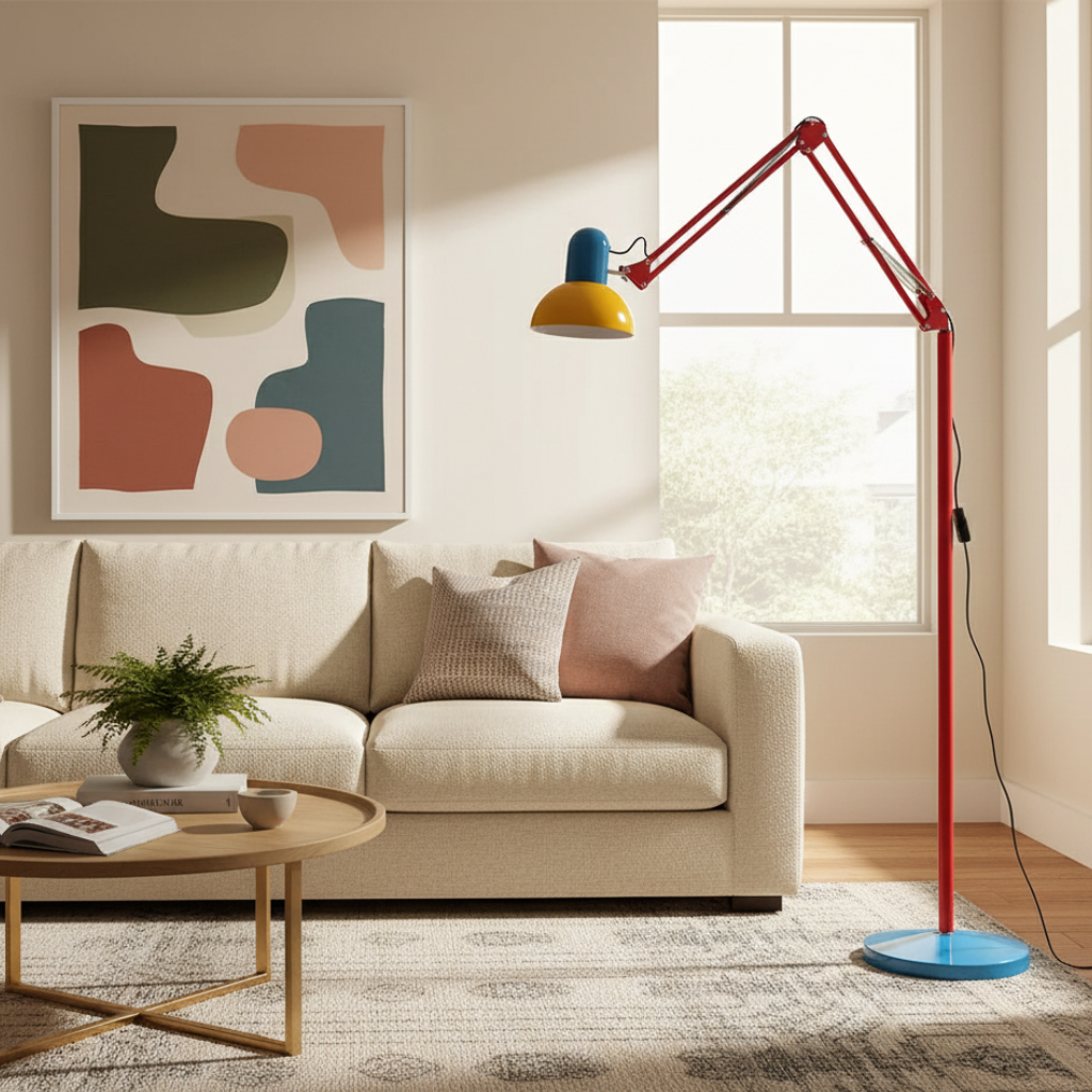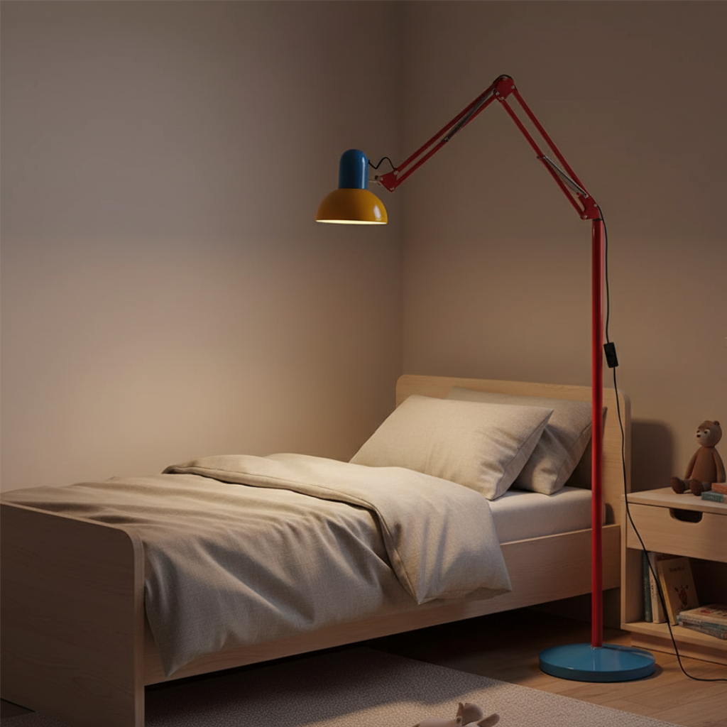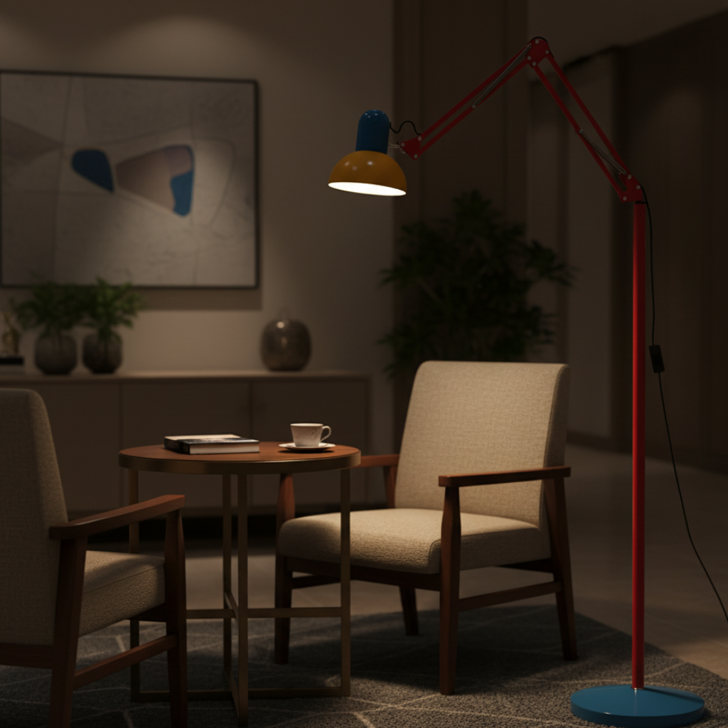 - Vivid Color Combination: Blue base, red arm, and yellow shade create a striking visual impact.
