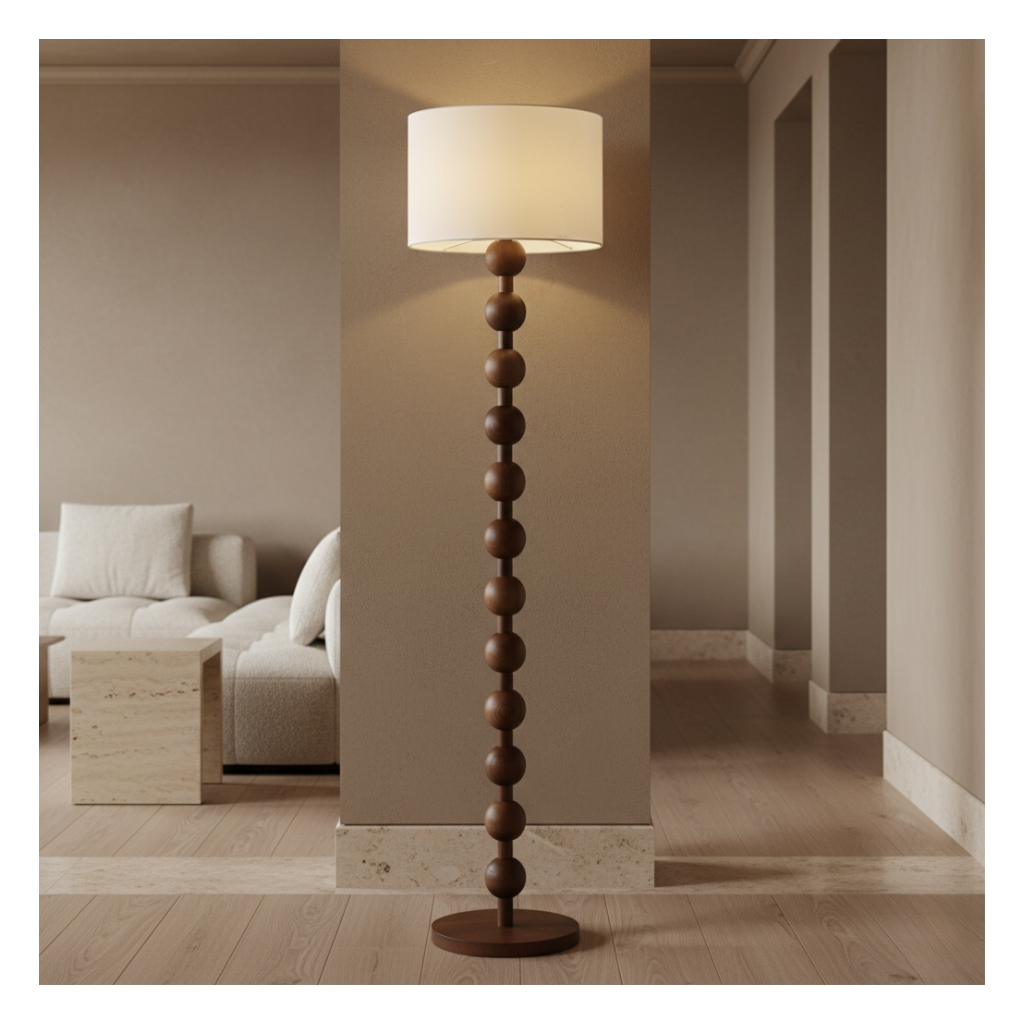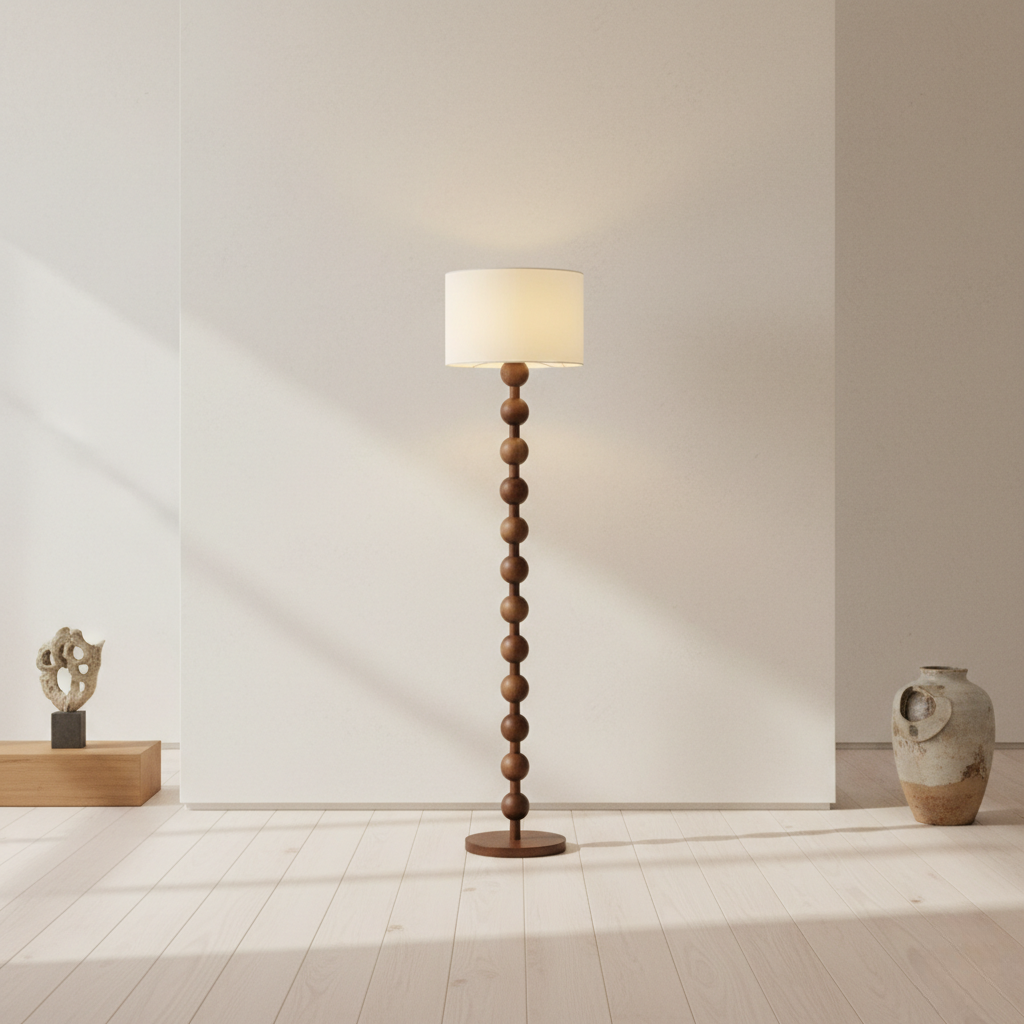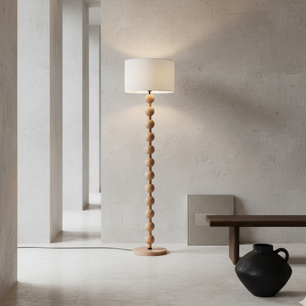The Hugo Barbell Floor Lamp beautifully merges the natural allure of wood with contemporary design. Its distinctive barbell-inspired form showcases a series of meticulously crafted wooden spheres that create a striking vertical aesthetic. Topped with a clean, white lampshade, this lamp emits a warm, diffused light, making it an ideal choice for enhancing the cozy atmosphere of any room.