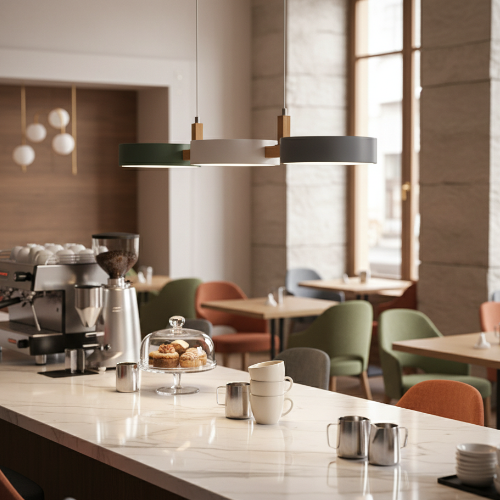 - Rhythmic Staggered Shades: Three clean, metal drum shades are playfully staggered along the beam for a dynamic sense of visual rhythm and interest.